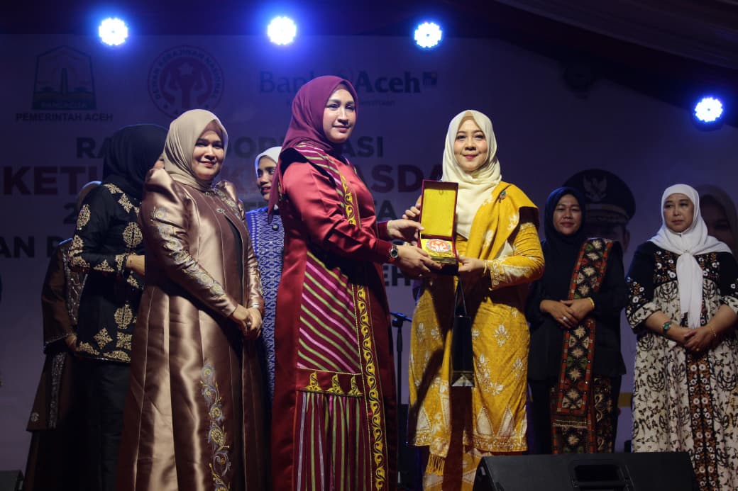 Penghargaan tersebut diserahkan langsung oleh Ketua Dekranasda Aceh, Ny. Marlina Muzakir, kepada Ny. Cut Inda TR. Keumangan dalam acara penutupan Rapat Koordinasi Ketua Dekranasda 23 Kabupaten/Kota dan Pameran Kriya Unggulan Dekranasda se-Aceh, yang berlangsung di UMKM Center Bank Aceh, Lampineung, Banda Aceh, Minggu malam (9/11/2025).